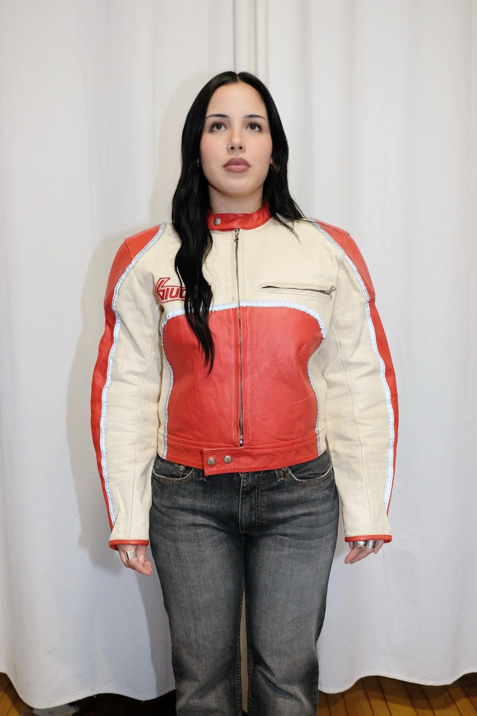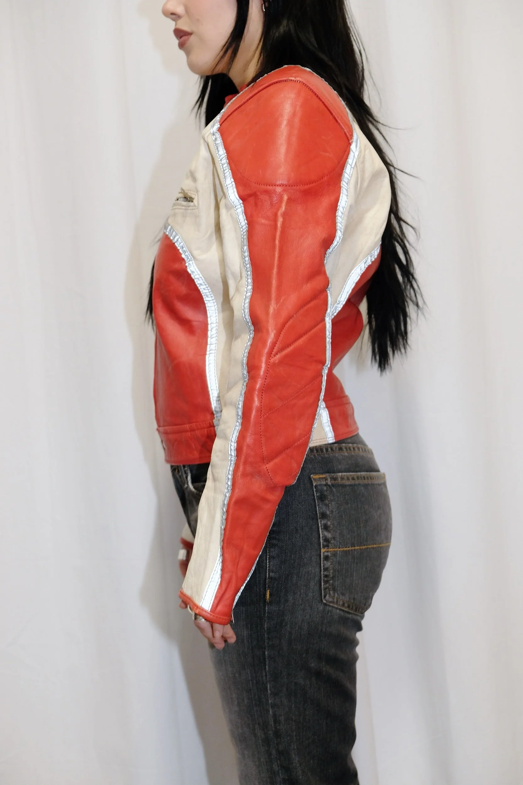 Real motorcycle racing jacket in a fabulous red and white with reflective piping. Has shoulder pads and elbow pads. Mesh lining with back shield pocket. Perfect for riding, or making a statement. Features some road burn on back.