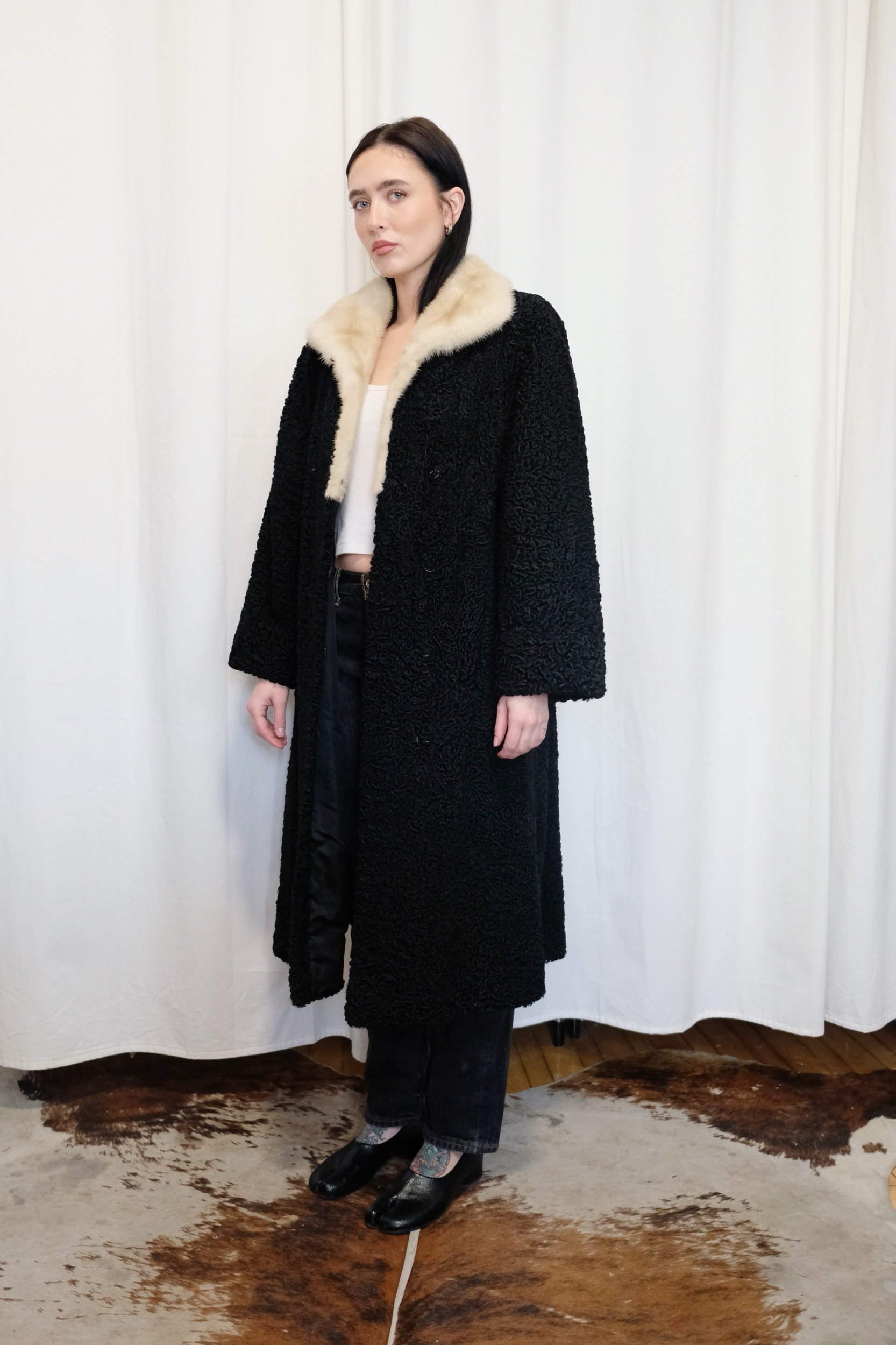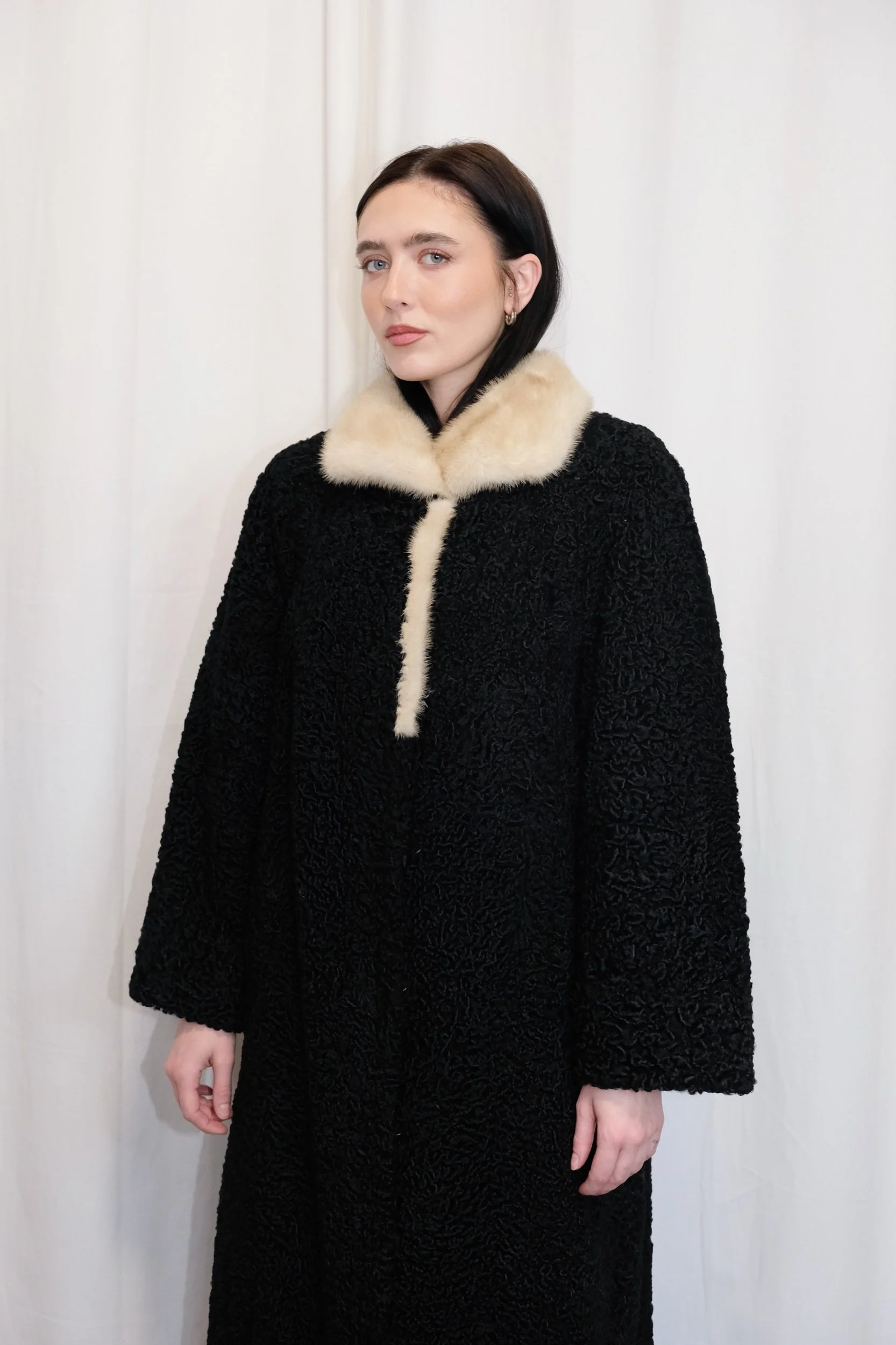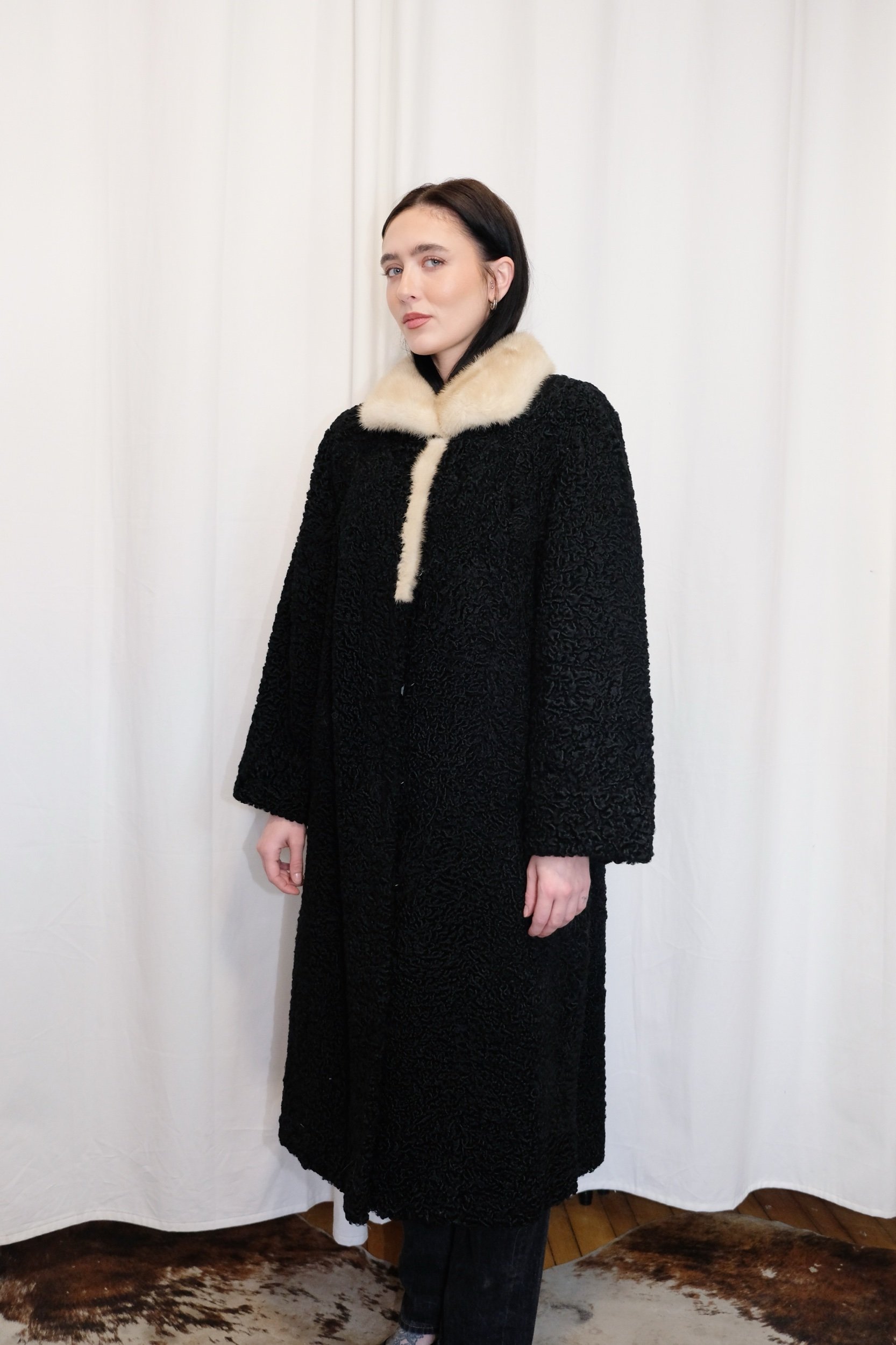 Beautiful 1960’s curly Persian lamb coat with white mink fur collar. Has 4 snap clasp closures, and hook and eye neck closure. Perfect A line cut.
