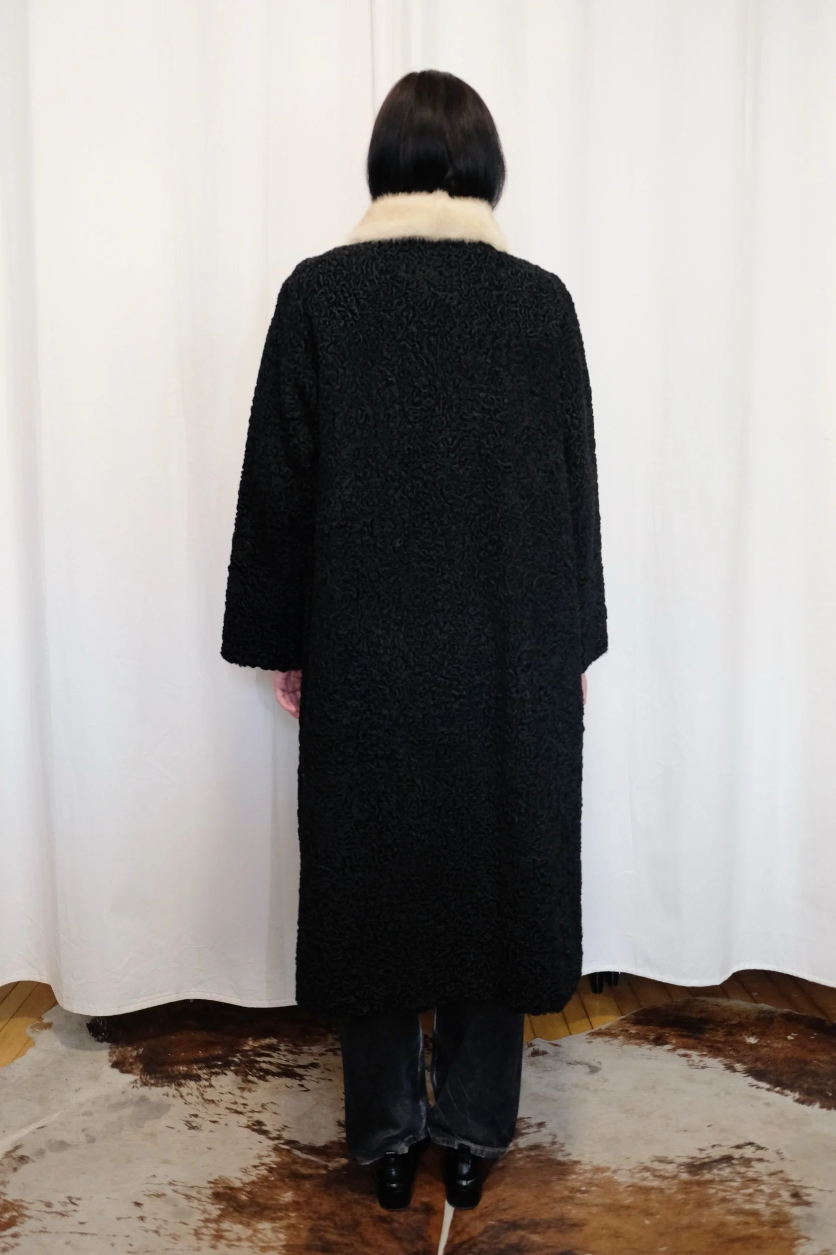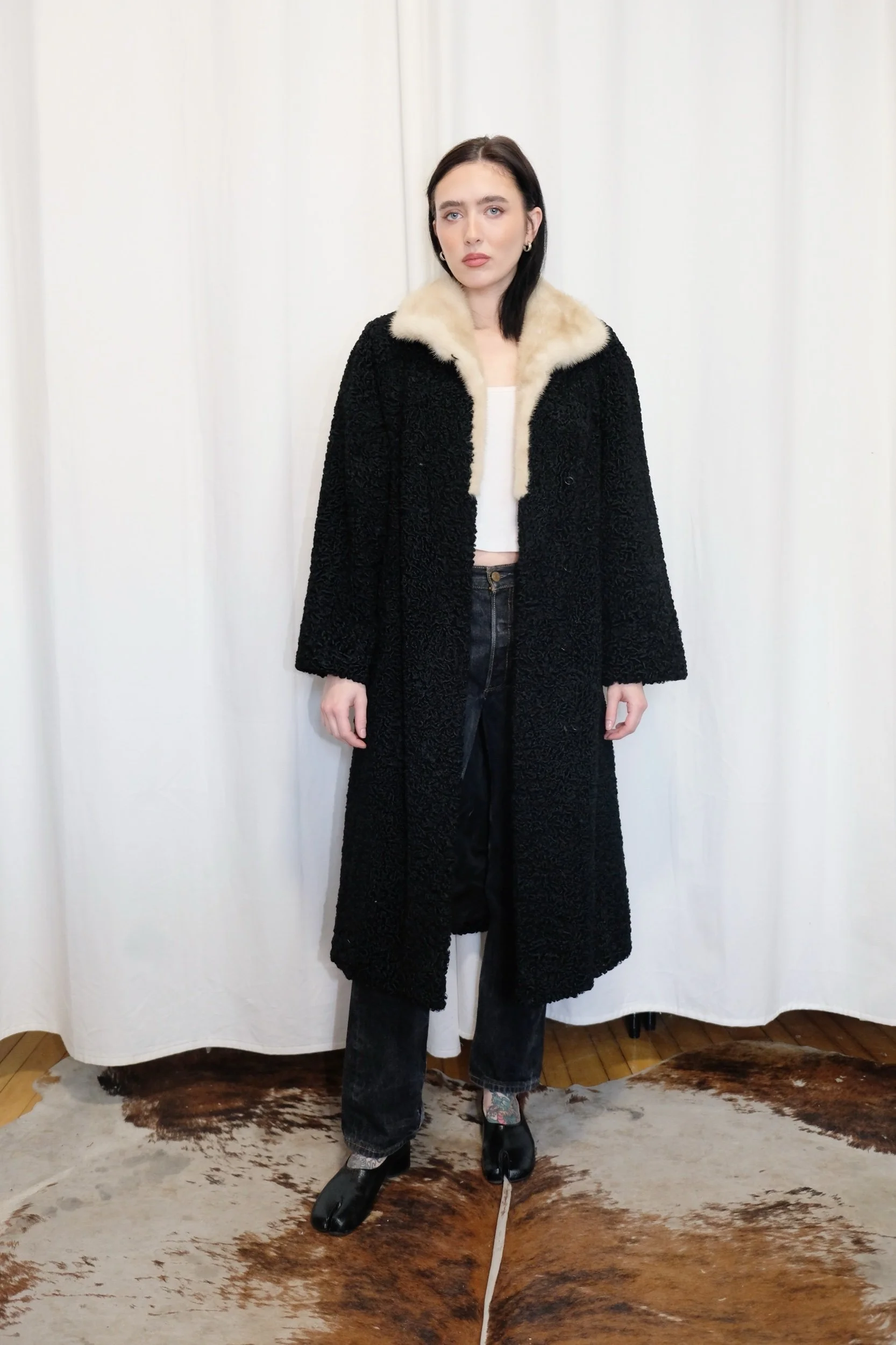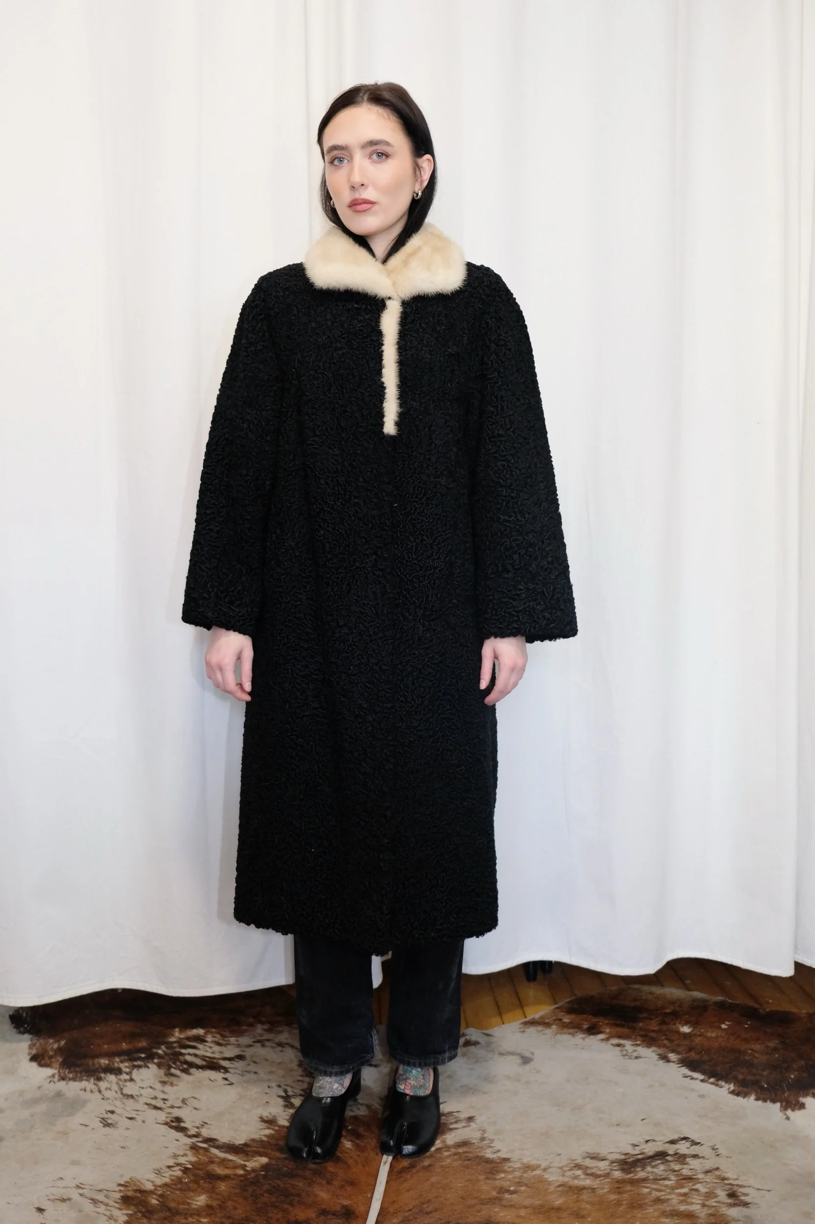 Beautiful 1960’s curly Persian lamb coat with white mink fur collar. Has 4 snap clasp closures, and hook and eye neck closure. Perfect A line cut.