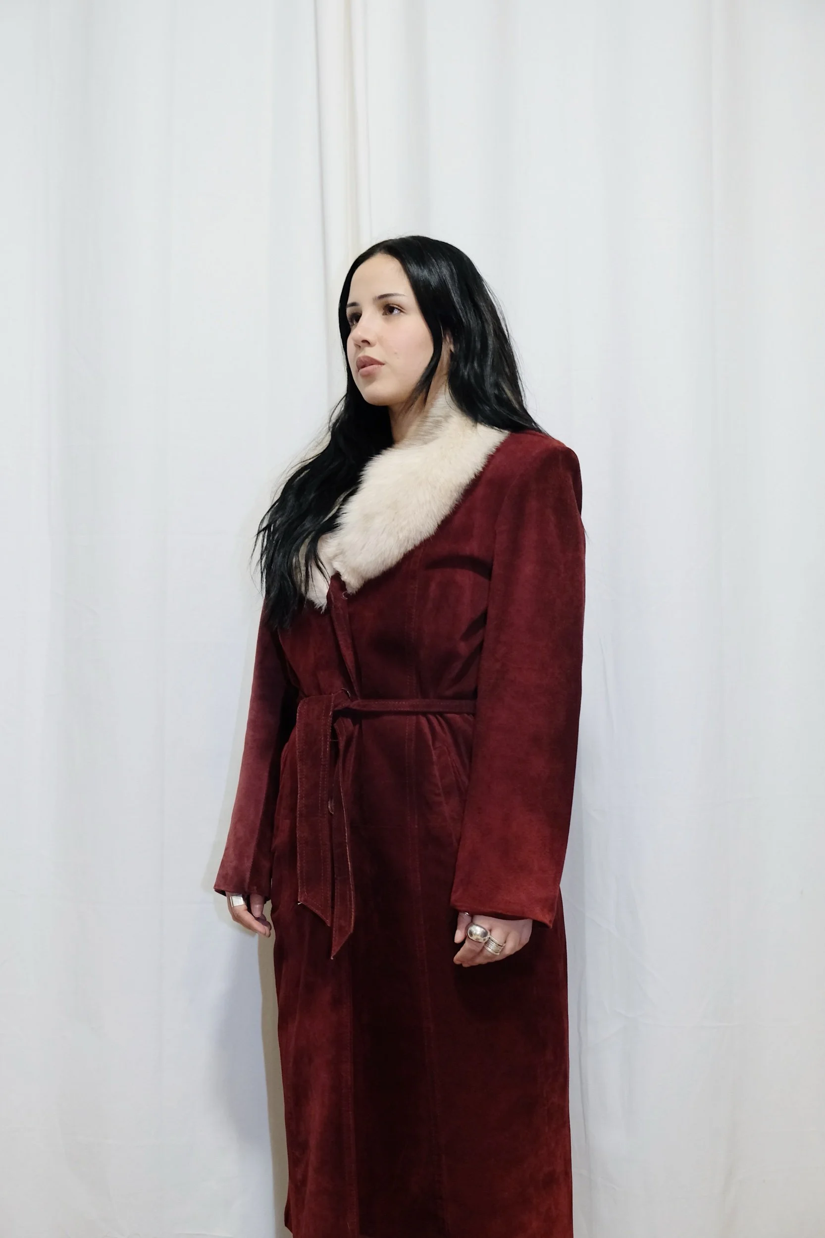 1970’s amazing raspberry red suede trench with fox fur trim and matching suede waist tie. Has quilted lining, to keep ya extra cozy.