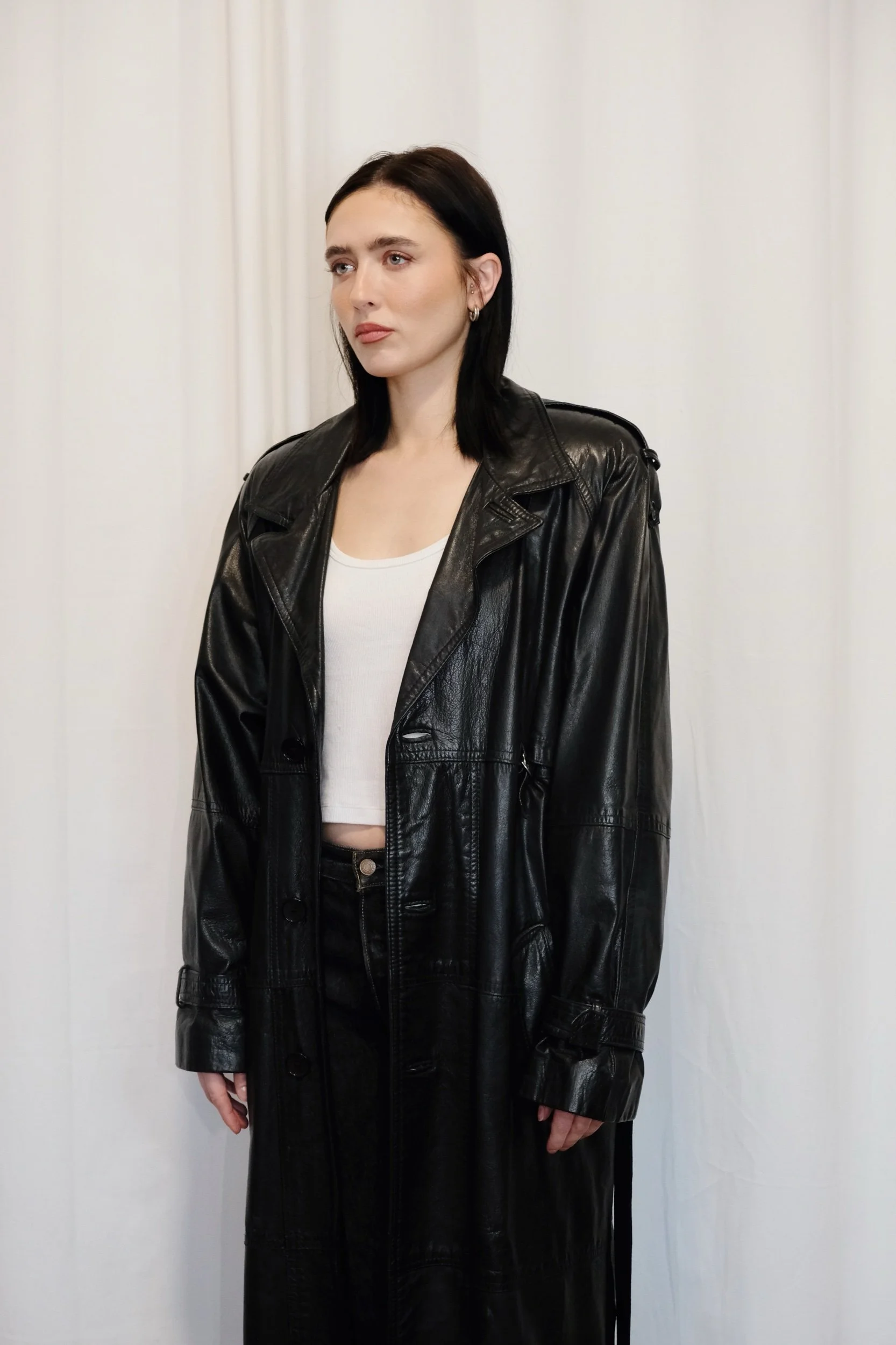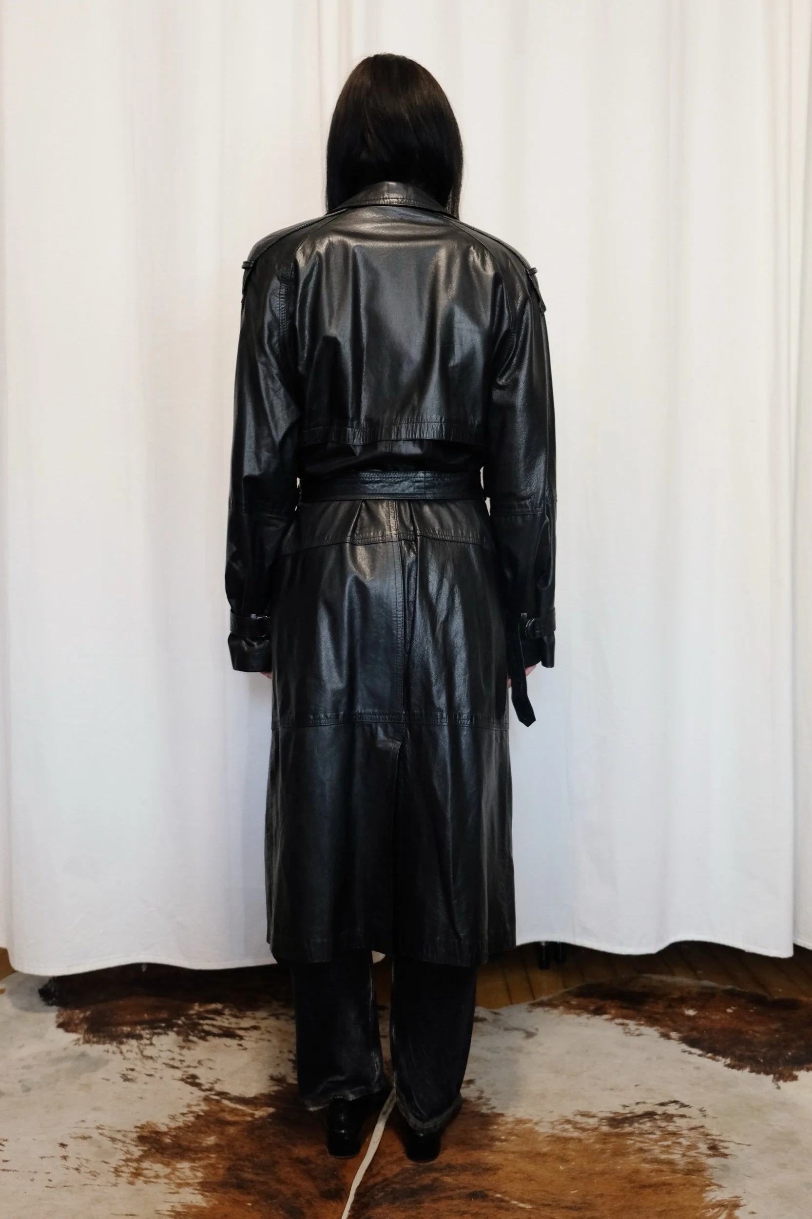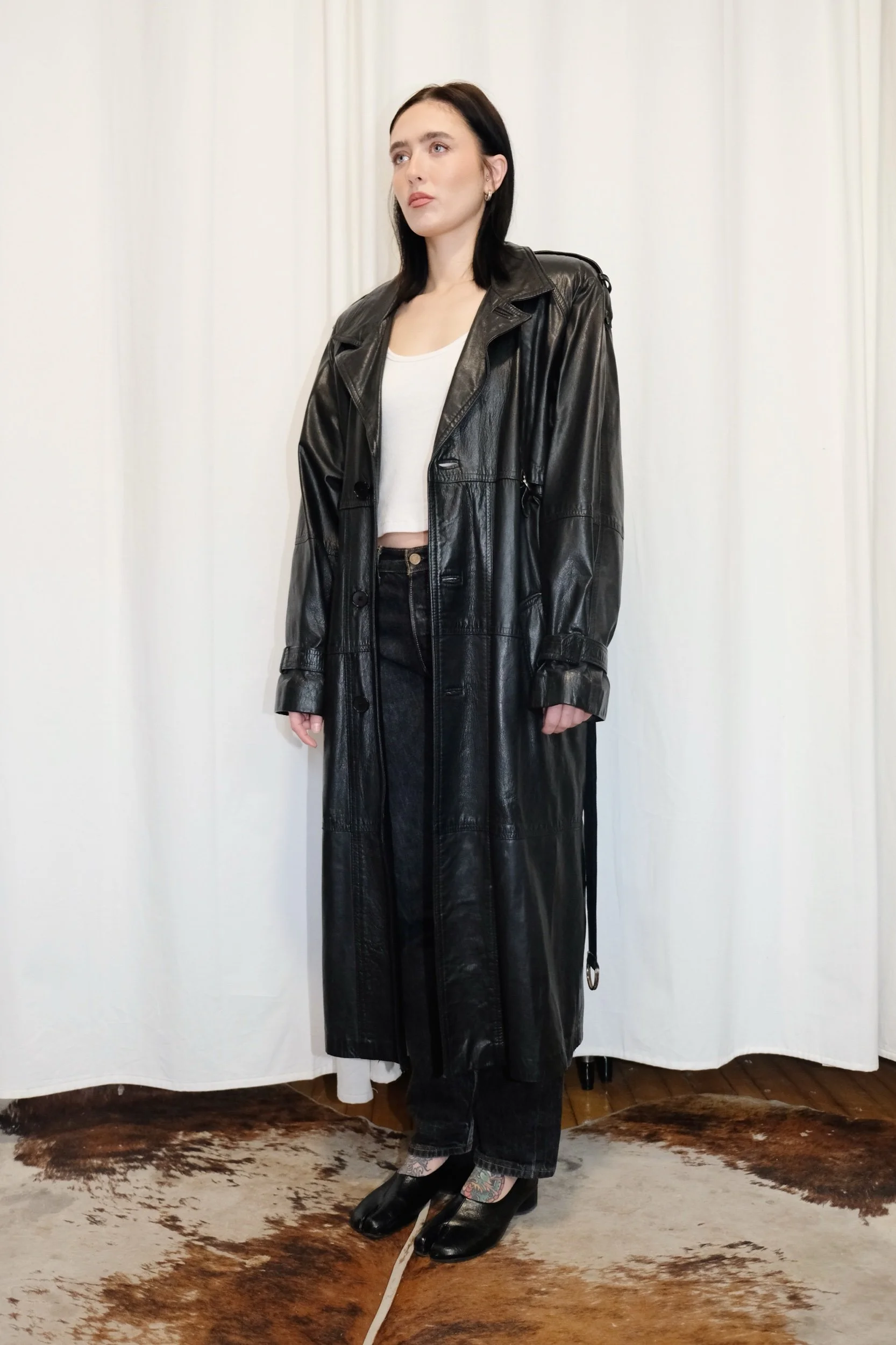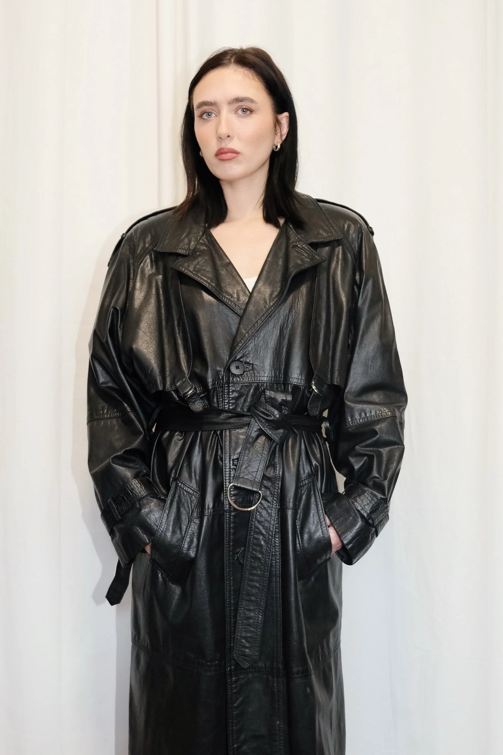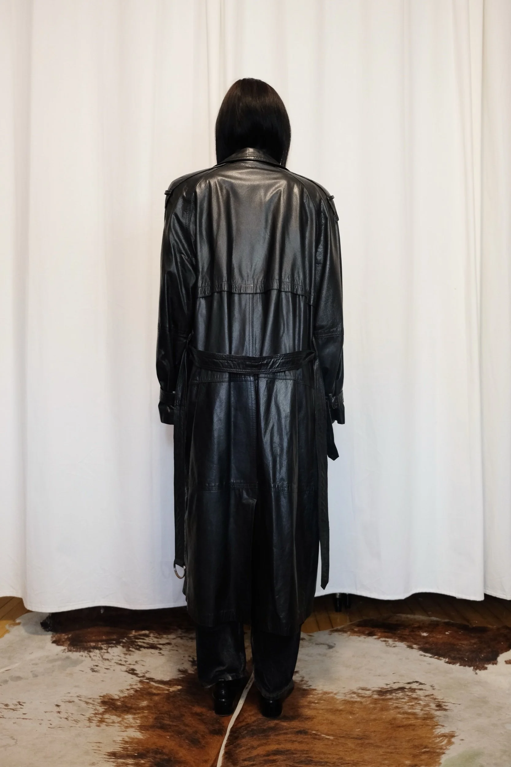 Black leather trench, with waist tie and storm shield. Amazing buckle details throughout.