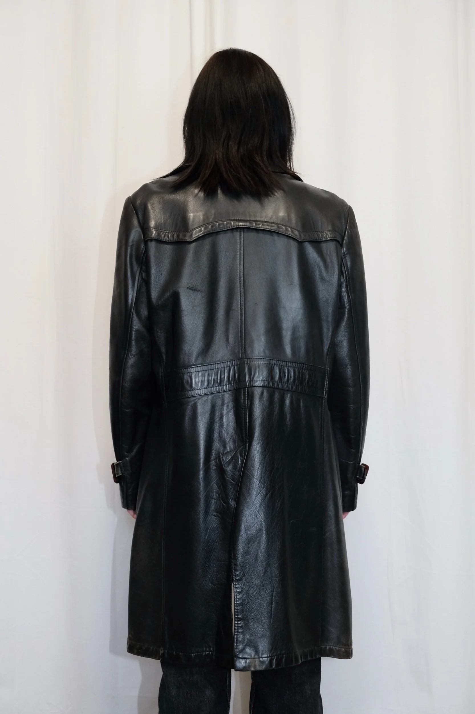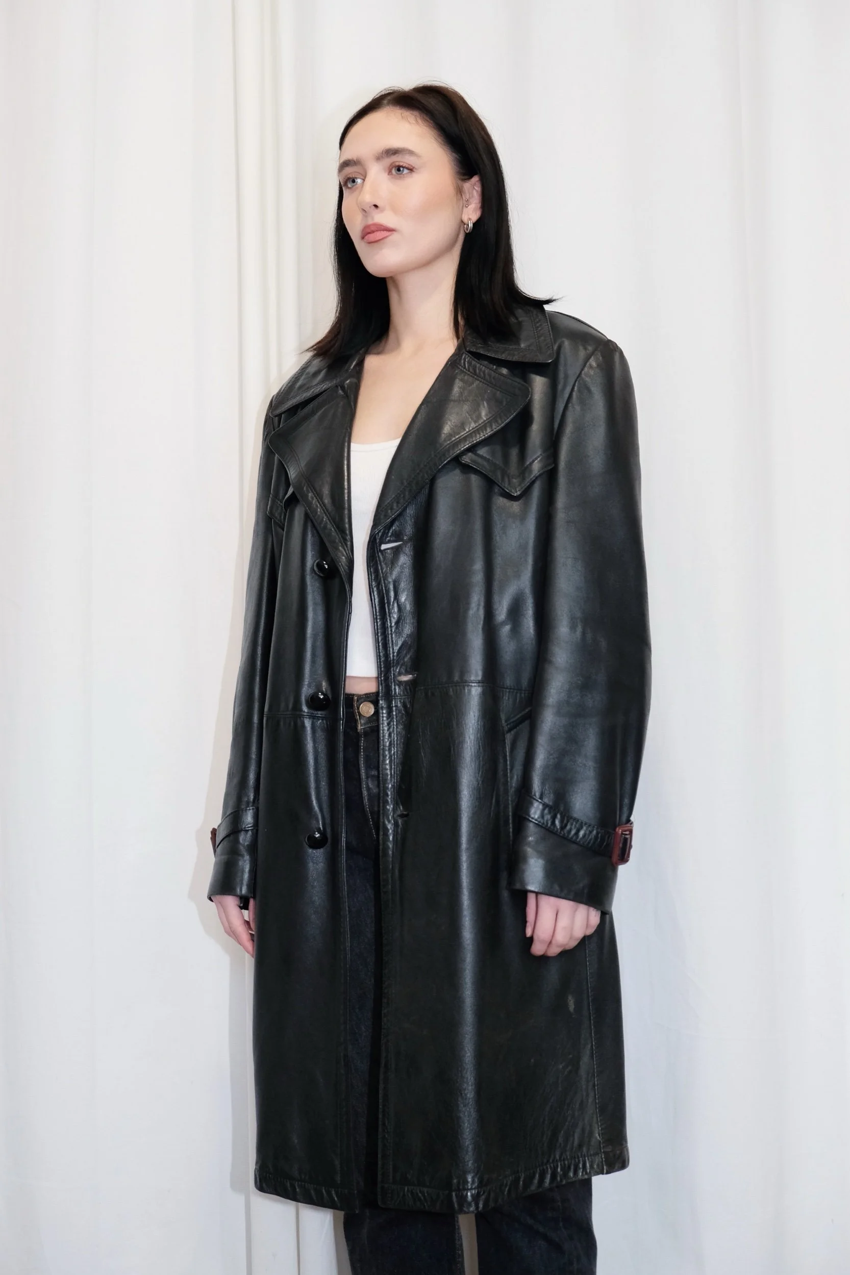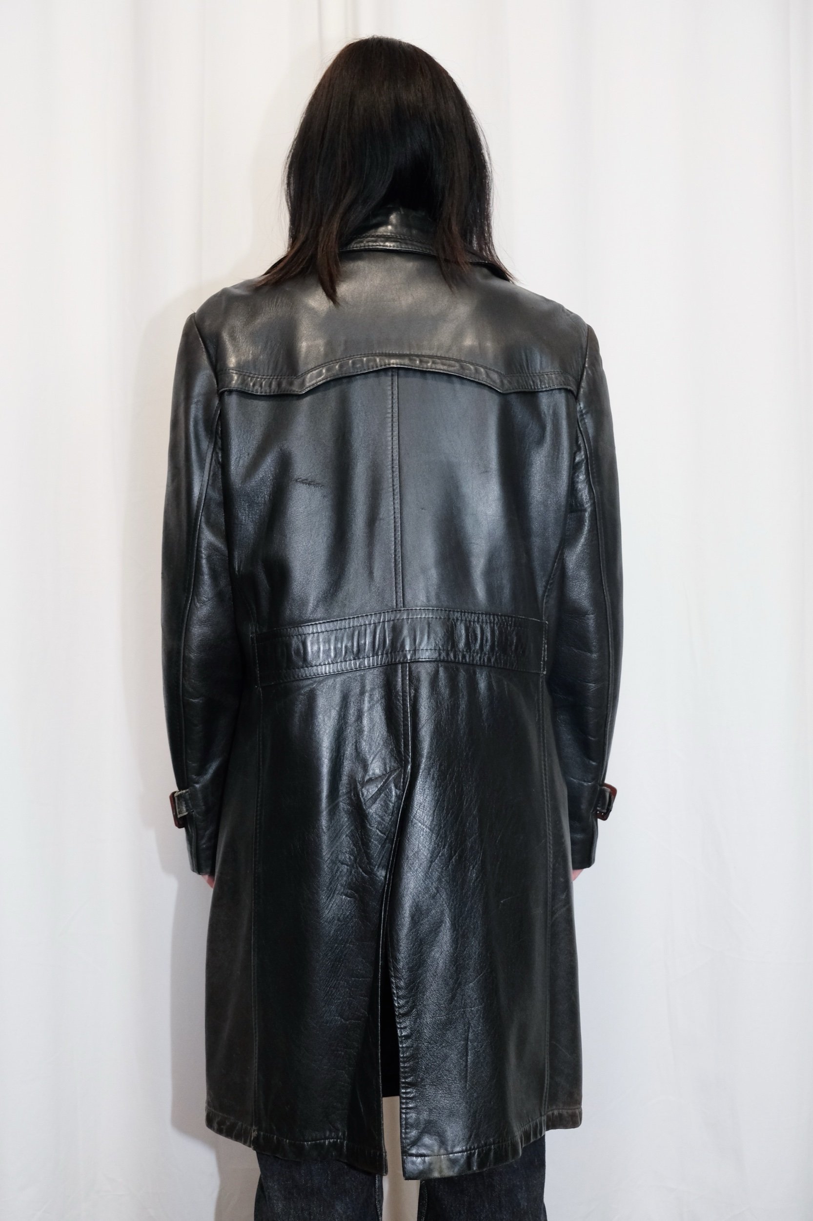 1970’s leather trench, with amazing wool blend zip out lining. Great for multi seasonal use, and a classic vintage design.